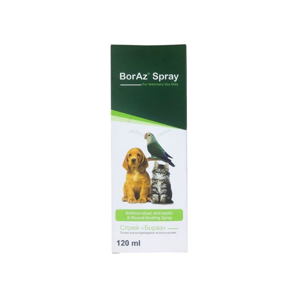 اسپری ضدعفونی و ترمیم کننده زخم حیوانات بورآز با حجم 120 میلی لیتر جهت درمان زخمهای پوستی، خارش، التهاب و عفونتهای باکتریایی و قارچی در حیوانات تولید شده است. اسپری بوراز شامل مواد فعال دیکوئینات سدیم، کلروهگزیدین و دکستران است.