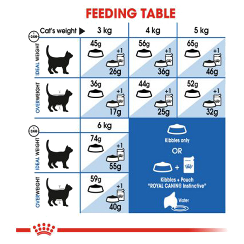 میزان مصرف پیشنهادی غذا رویال کنین مخصوص گربه داخل خانه بر اساس وزن گربه در جدول زیر و بر مبنای «گرم» آورده شده است:
